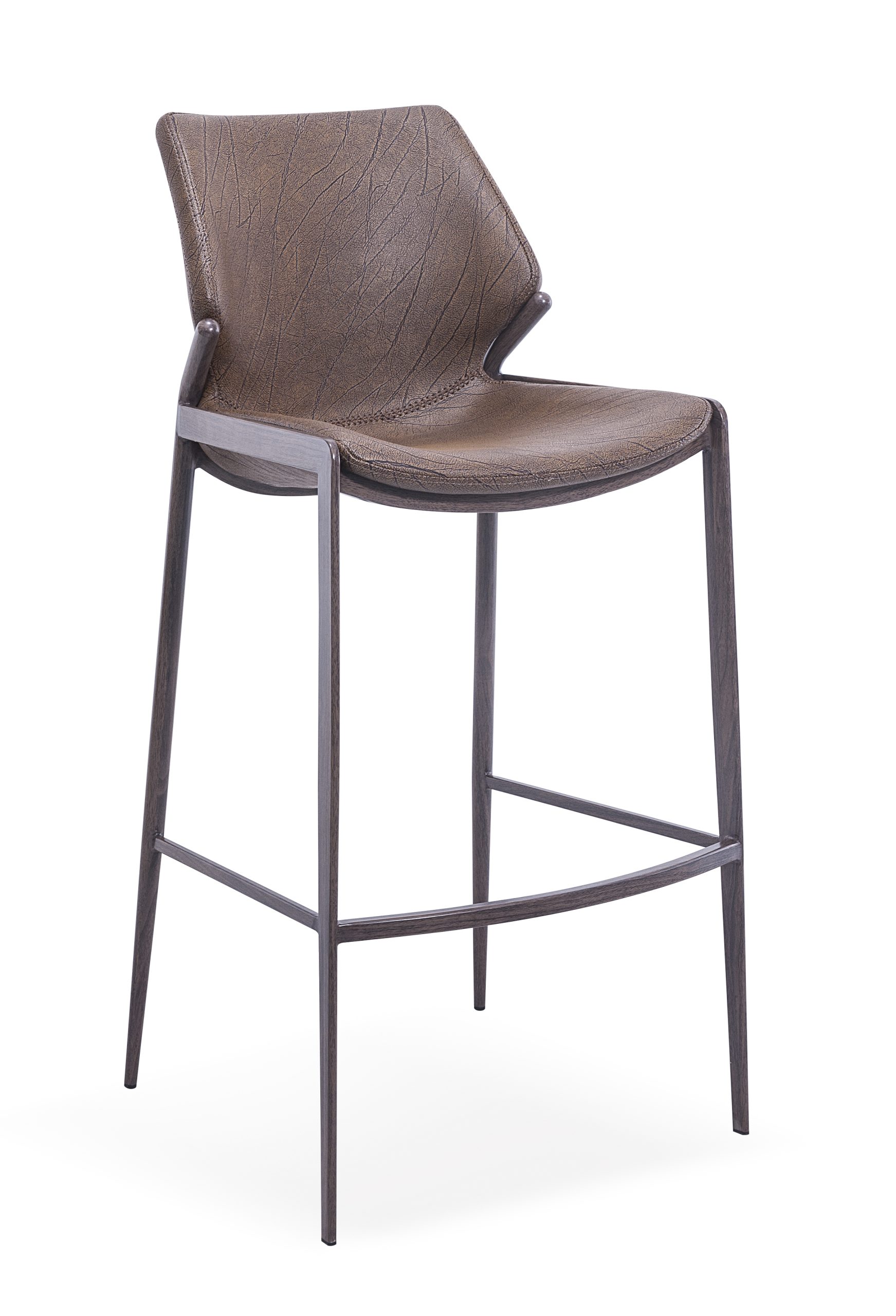 Our Banquet Halls and High Bar Stools are modern minimalist high stools specially designed for banquet halls and high-end bar scenarios by KONMA. The product combines retro textured leather to create an integrated backrest and seat, with a matte dark gray metal frame, perfectly integrating natural retro texture and industrial aesthetics. The unique shape of the backrest fits the curve of the human waist and hips, following ergonomic principles to provide comfortable support for long-time sitting scenarios such as banquets and cocktail parties. This bar stool is suitable for various scenarios such as hotel banquet halls, wedding bars, high-end restaurants, business clubs, etc., creating a high-end and elegant atmosphere for the space with its calm and atmospheric design.