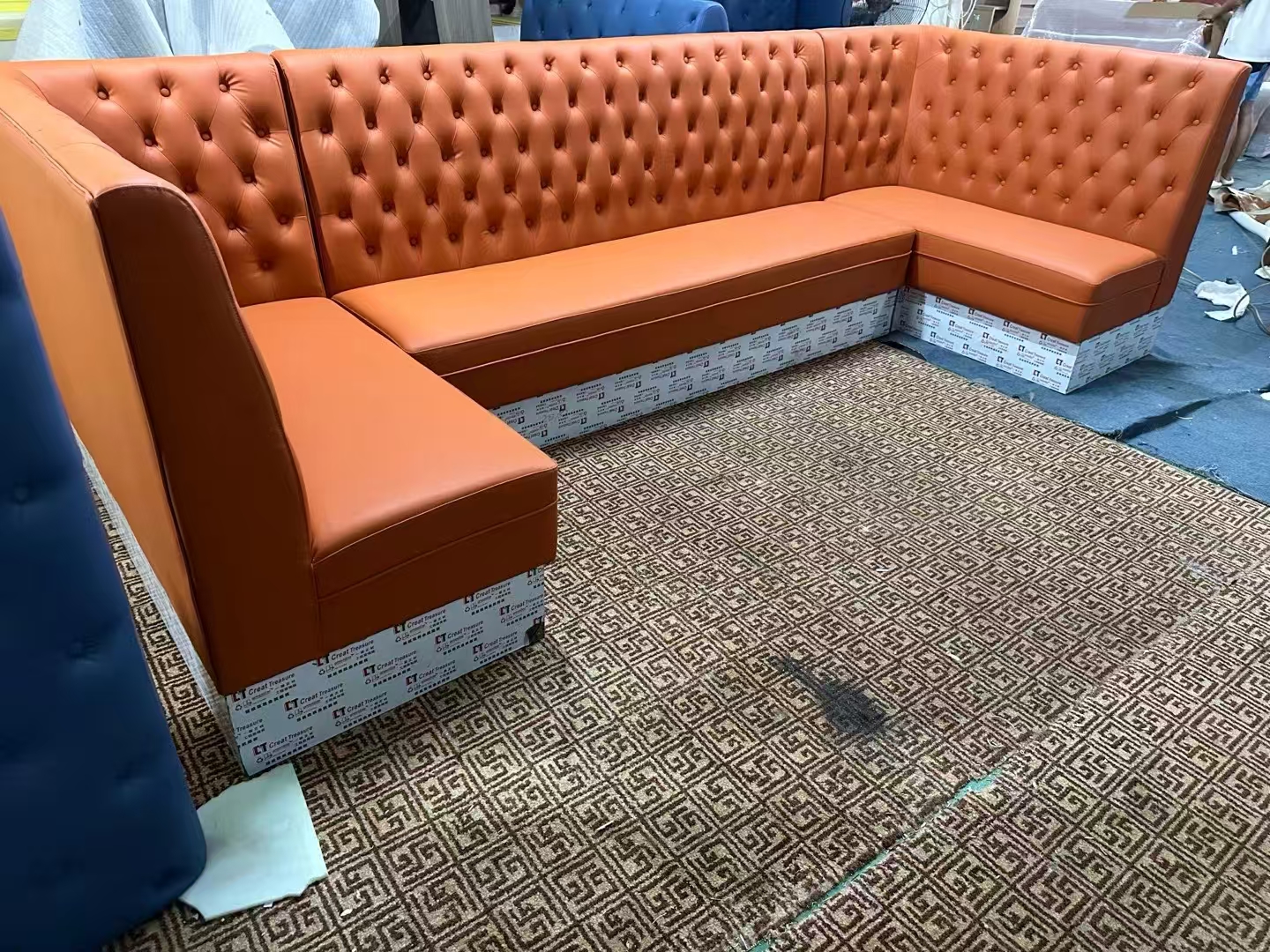 luxury tufted L-shaped corner booth from Guangzhou KONMA Catering Furniture Factory (20-year industry expertise). It features plush orange anti-stain leather upholstery, classic button-tufted backrest, and a curved corner L-structure—tailored for upscale restaurants, boutique bars, banquet private rooms and luxury lounges. The booth blends elegant tufted aesthetics, commercial-grade durability (stain-resistant leather + solid frame) and space-efficient corner layout (fits 4-6 guests), perfectly elevating the luxury vibe of high-end venues while meeting group-dining & space-utilization needs.