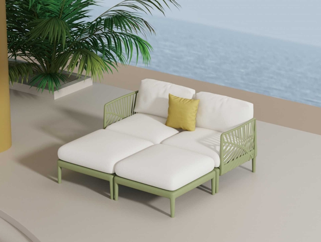 rattan outdoor dining set with cushions from KONMA. It features green weather-resistant rattan, plush white cushions, and a modular 3-piece design (2 chairs + 1 sofa + 1 table)—tailored for seaside terraces, backyard patios and resort outdoor dining areas. The set blends all-weather rattan durability (water/UV-resistant), soft cushion comfort, and tropical aesthetic, perfectly fitting outdoor leisure spaces.